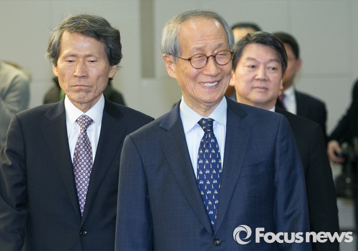 (서울=포커스뉴스) 27일 오전 서울 여의도 국회 의원회관에서 열린 국민의당-통합신당 통합발표 기자회견에 한상진(왼쪽부터), 윤여준 국민의당 공동창당준비위원장, 안철수 인재영입위원장이 참석하고 있다.