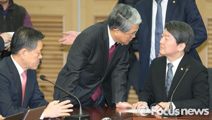 (서울=포커스뉴스) 27일 오전 서울 여의도 국회 의원회관에서 열린 국민의당-통합신당 통합발표 기자회견에 안철수(오른쪽) 국민의당 인재영입위원장과 김동철(가운데) 부위원장이 대화하고 있다. 왼쪽은 주승용 원내대표.