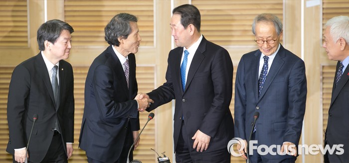 (서울=포커스뉴스) 27일 오전 서울 여의도 국회 의원회관에서 국민의당-통합신당 통합발표 기자회견을 마친 뒤 한상진 국민의당 공동창당준비위원장과 박주선 통합신당 창당준비위원장이 악수하고 있다. 왼쪽부터 안철수 국민의당 인재영입위원장, 한 공동위원장, 박 위원장, 윤여준 국민의당 창당준비위원장, 김한길 상임부위원장.
