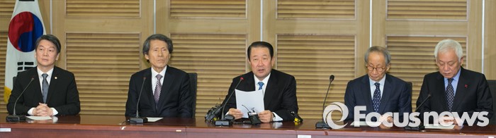 (서울=포커스뉴스) 27일 오전 서울 여의도 국회 의원회관에서 열린 국민의당-통합신당 통합발표 기자회견에 참석한 안철수(왼쪽부터) 국민의당 인재영입위원장, 한상진 공동창당준비위원장, 박주선 통합신당 창당준비위원장, 윤여준 국민의당 공동창당준비위원장, 김한길 상임부위원장이 발표문을 낭독하고 있다.