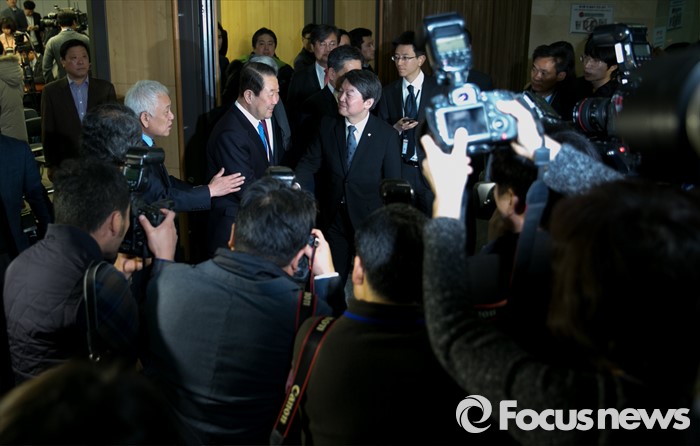 (서울=포커스뉴스) 27일 오전 서울 여의도 국회 의원회관에서 국민의당-통합신당 통합발표 기자회견을 마친 뒤 퇴장하며 안철수 국민의당 인재영입위원장과 박주선 통합신당 창당준비위원장이 인사하고 있다.
