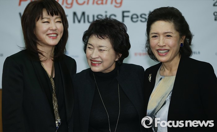 (서울=포커스뉴스) 27일 오전 서울 중구 엠버서더 호텔에서 열린 '2016 평창겨울음악제' 기자간담회에 참석한 재즈보컬리스트 나윤선(왼쪽부터), 음악감독 정경화, 정명화가 환한 미소를 짓고 있다.