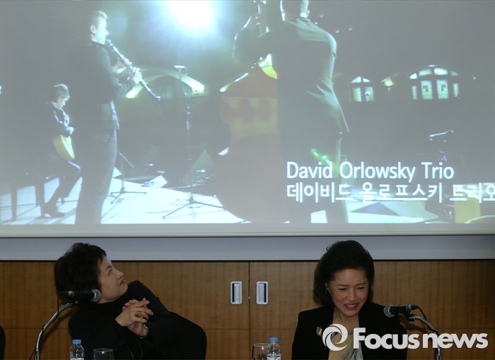 (서울=포커스뉴스) 27일 오전 서울 중구 엠버서더 호텔에서 열린 '2016 평창겨울음악제' 기자간담회에 참석한 정경화(왼쪽) 음악감독이 참여 아티스트 소개영상을 바라보고 있다. 왼쪽부터 음악감독 정경화, 정명화.