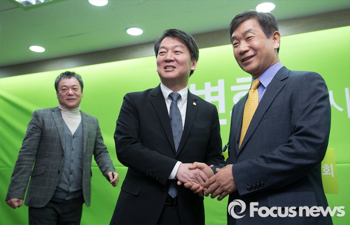 (서울=포커스뉴스) 국민의당 안철수 의원이 27일 오전 서울 마포구 국민의당 당사에서 입당 인사 소개를 마친 후 국민의당 언론특보로 선임 된 한명규 코라오 그룹 부회장과 인사를 나누고 있다.
