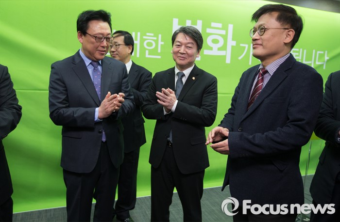 (서울=포커스뉴스) 더불어민주당 출신 정무직 당직자들이 27일 오전 서울 마포구 국민의당 당사 브리핑룸에서 열린 입당 기자회견을 마친 후 안철수 인재영입위원장과 함께 박수를 치고 있다.