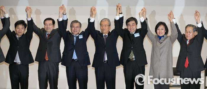(서울=포커스뉴스) 27일 오후 서울 여의도 국회에서 열린 더불어민주당 중앙위원회의에 참석한 문재인 대표와 김종인 선거대책위원장 겸 비대위원장 등 위원들이 취재진을 향해 포즈를 취하고 있다. 왼쪽부터 김병관, 이용섭 비대위원, 문 대표, 김 위원장, 이종걸 원내대표, 박영선, 우윤근 비대위원.