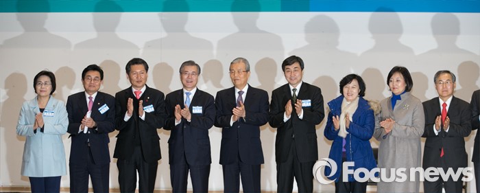 (서울=포커스뉴스) 27일 오후 서울 여의도 국회에서 열린 더불어민주당 중앙위원회의에 참석한 문재인 대표 등 지도부와 김종인 선거대책위원장 겸 비상대책위원장 등 비대위원들이 취재진을 향해 포즈를 취하고 있다. 왼쪽부터 유승희, 전병헌, 정청래 최고위원, 문 대표, 김 위원장, 이종걸 원내대표, 추미애 최고위원, 박영선, 우윤근, 비대위원.