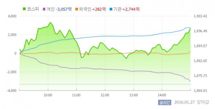 27일 코스피지수는 전일 대비 1.40%(26.18포인트) 오른 1897.87에 장을 마쳤다. 코스닥지수는 전날보다 0.53%(3.60포인트) 내린 675.25에 마감했다.
