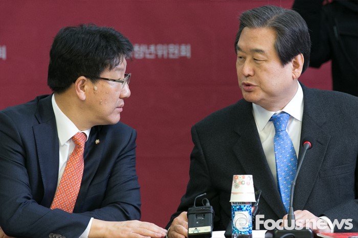 (서울=포커스뉴스) 김무성(오른쪽) 새누리당 대표와 권성동 의원이 27일 오후 서울 여의도 국회 의원회관에서 열린 청년 공천 설명회에 참석해, 대화하고 있다.