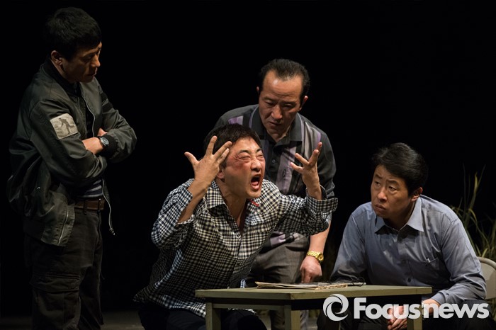 (서울=포커스뉴스) 27일 오전 서울 중구 명동예술극장에서 열린 연극 '날 보러와요' 프레스콜에 배우 김뢰하(조형사), 류태호(용의자), 유연수(박형사), 이대연(김반장)이 연기하고 있다.