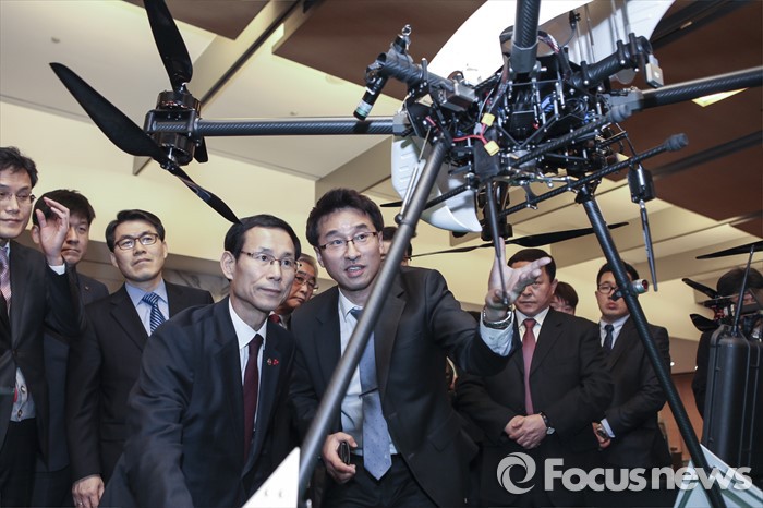 (서울=포커스뉴스) 최정호 2차관이 27일 오후 서울 중구 대한상공회의소에서 열린 무인비행장치(드론) 시범사업 MOU 체결식에 참석해 드론을 살피고 있다. <사진제공=국토교통부>