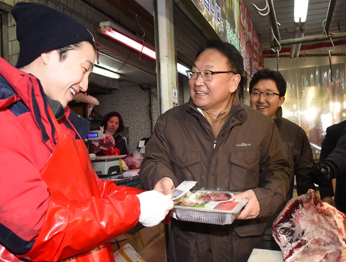 (서울=포커스뉴스) 유일호 부총리 겸 기획재정부 장관이 27일 오후 설 민생대책 후속조치일환으로 설맞이 전통시장 그랜드세일행사를 하고 있는 서울 양천구 신영시장을 방문해 성수품을 구입하고 있다. <사진제공=기획재정부>