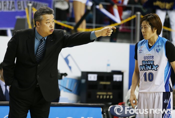 (용인=포커스뉴스) 27일 용인실내체육관에서 열린 2015-2016 여자프로농구 삼성생명-KB스타즈 경기에서 삼성생명 임근배 감독이 경기중 고아라에게 수비 위치에 대해 지시하고 있다.