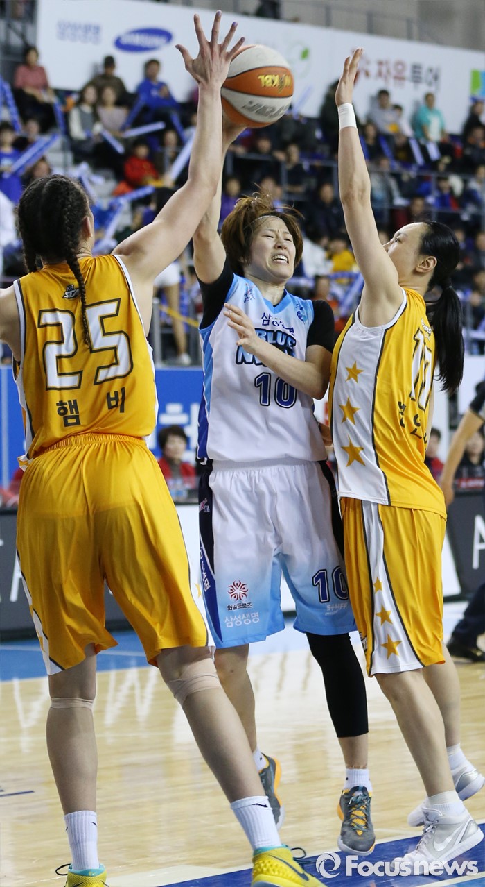 (용인=포커스뉴스) 27일 용인실내체육관에서 열린 2015-2016 여자프로농구 삼성생명-KB스타즈 경기에서 삼성생명 고아라가 KB스타즈 햄비와 변연하의 밀착 수비에 막히자 패스를 시도하고 있다.