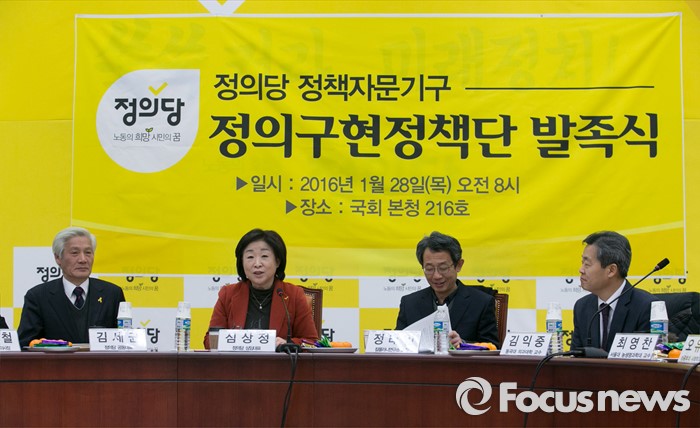 (서울=포커스뉴스) 28일 오전 서울 여의도 국회에서 정의당 정책자문기구 정의구현정책단 발족식에 참석한 심상정(왼쪽 두번째) 상임대표가 인사말을 하고 있다.