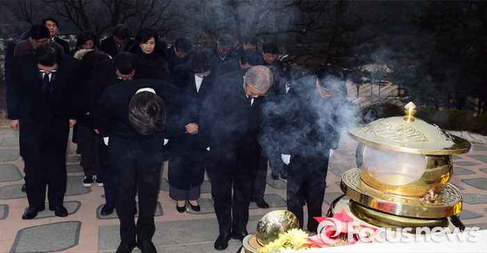 (서울=포커스뉴스) 28일 오전 서울 동작구 국립현충원을 찾은 김종인 더블어민주당 비상대책위원장이 비대위원들과 김대중 전 대통령 묘역을 참배하고 있다.