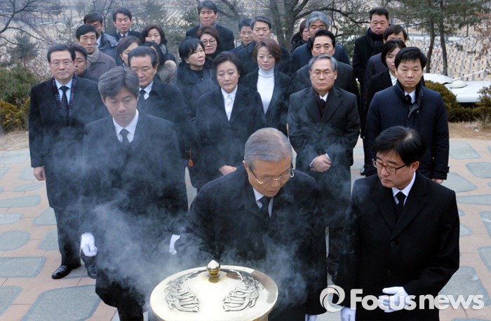 (서울=포커스뉴스) 28일 오전 서울 동작구 국립현충원을 찾은 김종인 더블어민주당 비상대책위원장이 비대위원들과 김대중 전 대통령 묘역을 참배하고 있다.