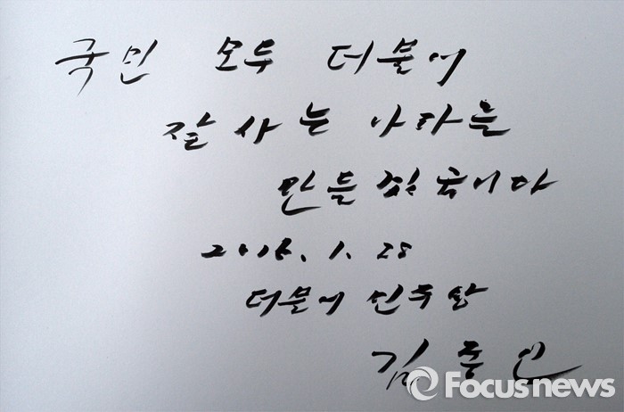 (서울=포커스뉴스) 28일 오전 서울 동작구 국립현충원을 찾은 김종인 더블어민주당 비상대책위원장이 남긴 방명록. 김 위원장은 "국민 모두 더불어 잘 사는 나라를 만들겠습니다" 라는 문장을 남겼다.