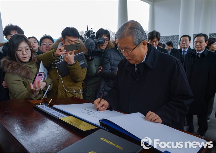 (서울=포커스뉴스) 28일 오전 서울 동작구 국립현충원을 찾은 김종인 더블어민주당 비상대책위원장이 방명록을 작성하고 있다.