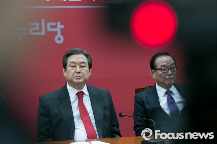 (서울=포커스뉴스) 김무성(왼쪽) 새누리당 대표와 서청원 최고위원이 28일 오전 서울 여의도 국회에서 열린 최고위원회의에 참석해, 어색한 표정으로 앉아 있다. 이 자리에서 서 최고위원은 김 대표를 향해 “김무성 대표가 권력자 발언을 해서 왜 이런 이야기를 해서 분란을 일으키느냐”고 정면 비판했다.