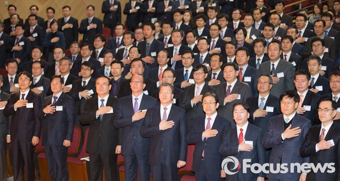 (세종=포커스뉴스) 임환수 국세청장이 28일 오전 세종시 정부세종2청사 국세청에서 열린 전국세무관서장회의에 참석해 국기에 대한 경례를하고 있다.