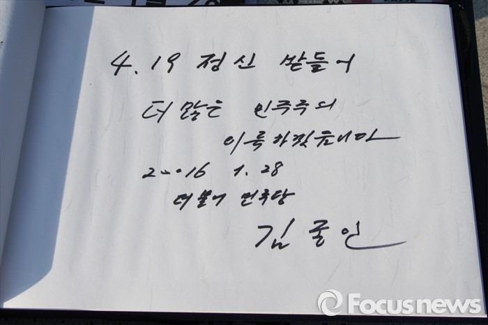 (서울=포커스뉴스) 28일 오전 서울 강북구 국립 4.19 묘지를 찾은 김종인 선거대책위원장 겸 비대위원장이 남긴 방명록. 김 위원장은 "4.19 정신 받들어 더 많은 민주주의 이룩하겠습니다"라는 문장을 남겼다.
