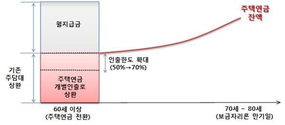 이밖에 소득이나 자산이 일정 기준 이하인 고령층, 저소득층에 대해 더 많은 연금을 지급하는 '우대형 상품'도 도입한다.주택담보대출→주택연금 전환 상품구조 <자료제공=금융위원회>