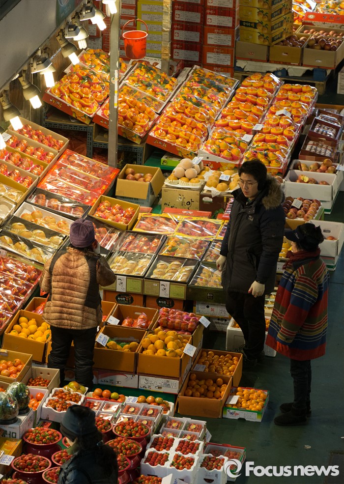 (대전=포커스뉴스) 설 멸정을 앞두고 28일 오전 대전 유성구 농수산물도매시장에서 상인들이 대목준비에 바쁘게 움직이고 있다.