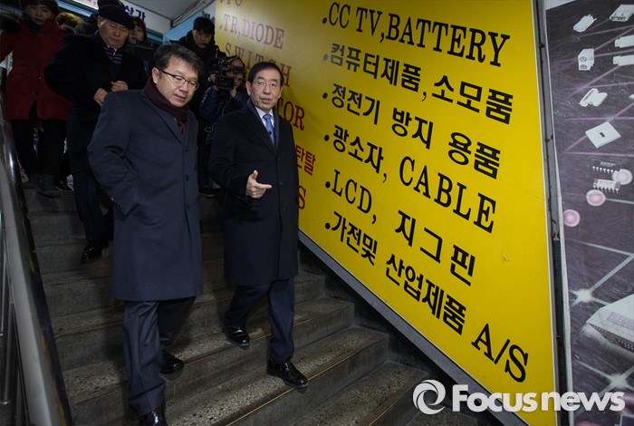 (서울=포커스뉴스) 박원순 서울시장이 28일 오전 서울 종로구 세운상가에서 열린 세운상가 재생사업 현장 설명회에 참석해 상가를 둘러보고 있다.