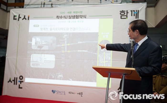 (서울=포커스뉴스) 박원순 서울시장이 28일 오전 서울 종로 세운상가에서 열린 세운상가 재생사업 현장 설명회에 참석해 사업 발표를 하고 있다.