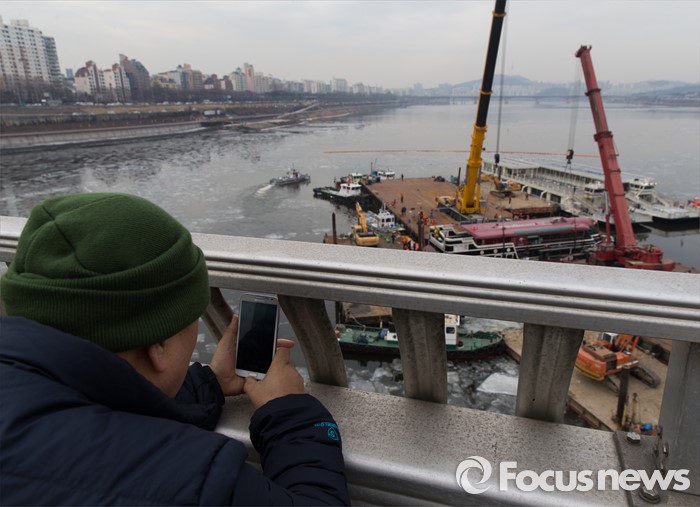 (서울=포커스뉴스) 28일 오후 서울 한강 영동대교 인근에서 한 시민이 침수된 이랜드 크루즈 유람선 인양 작업을 핸드폰으로 촬영하고 있다.