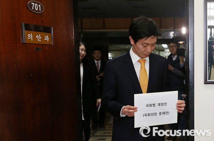 (서울=포커스뉴스) 28일 오후 서울 여의도 국회에서 국회의장실 장우진 정무비서관이 정의화 국회의장이 대표발의한 국회법 개정안 중재안을 의안과에 제출하고 있다.