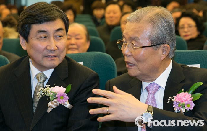 (서울=포커스뉴스) 28일 오후 서울 여의도 국회도서관에서 열린 더불어민주당 60년사 출판기념회에 참석한 김종인(오른쪽) 비대위원장과 이종걸 원내대표가 대화하고 있다.