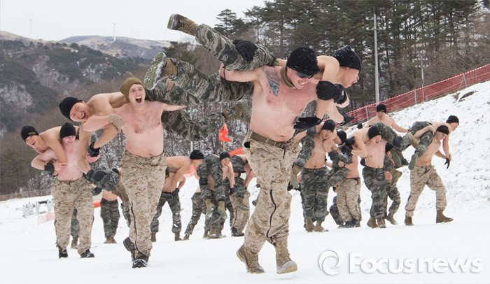 (평창=포커스뉴스) 28일 강원도 평창군 황병산 해병대 산악 종합훈련장에서 열린 '한·미 해병대 연합 동계 설한지 훈련'에 해병대 수색대대와 미 해병대 3사단 수색중대 장병들이 참가하고 있다.