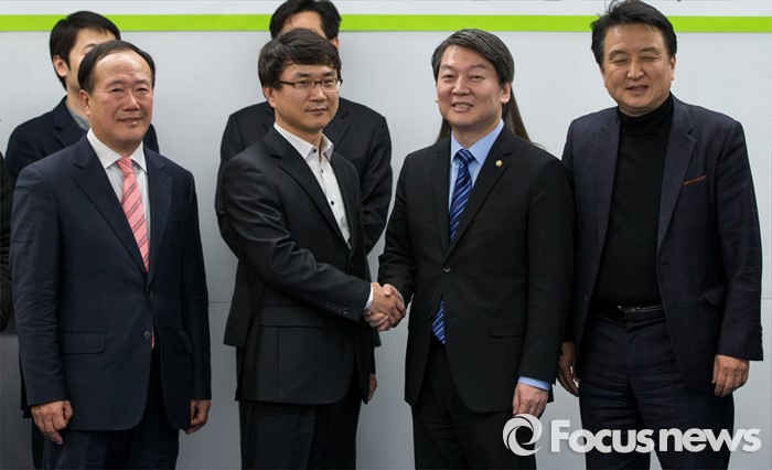 (서울=포커스뉴스) 28일 오후 서울 강남구 창업지원센터에서 열린 '국민의당-핀테크 기업인 간담회'에 참석한 안철수(오른쪽 두번째) 인재영입위원장이 국민의당 정책자문으로 영입된 유철종(왼쪽 두번째) 크라우드연구소 대표와 악수하고 있다.