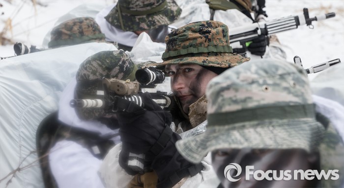 (평창=포커스뉴스) 28일 강원도 평창군 황병산 해병대 산악 종합훈련장에서 열린 '한·미 해병대 연합 동계 설한지 훈련'에 해병대 수색대대와 미 해병대 3사단 수색중대 장병들이 참가하고 있다.