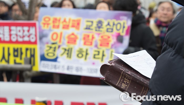 (세종=포커스뉴스) 28일 오후 세종시 정부세종청사 1동 앞에서 한국기독교총연합회, 한국교회연합회, 한국장로교총연합회, 한국교회언론회 등 종교인들이 집회를 갖고 할랄식품 테마단지 추진을 중단할 것을 촉구하고 있다.