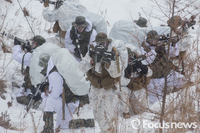 (평창=포커스뉴스) 28일 강원도 평창군 황병산 해병대 산악 종합훈련장에서 열린 '한·미 해병대 연합 동계 설한지 훈련'에 해병대 수색대대와 미 해병대 3사단 수색중대 장병들이 참가하고 있다.