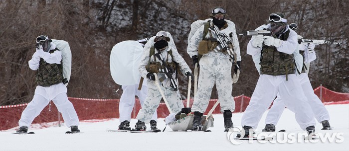 (평창=포커스뉴스) 28일 강원도 평창군 황병산 해병대 산악 종합훈련장에서 열린 '한·미 해병대 연합 동계 설한지 훈련'에 해병대 수색대대와 미 해병대 3사단 수색중대 장병들이 참가하고 있다.