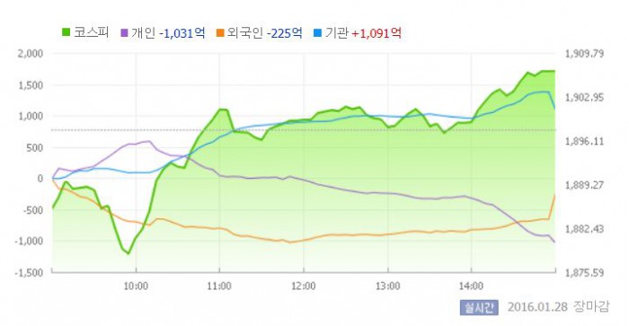 이날 코스피는 전일대비 0.66% 하락한 1885.38로 장을 시작했다. 이후 지수는 외국인의 매도 전환에 낙폭을 확대했다. 외국인은 전날 순매수로 전환한지 하루만에 다시 '팔자'로 방향을 틀었다. 그러나 장 중반 기관의 매수세가 유입되면서 상승 반전해 1900선을 회복했다.