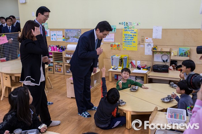 (서울=포커스뉴스) 만3-5세 유아에게 공통적으로 제공하는 교육, 보육 과정인 누리과정 예산 파행으로 보육대란이 이어지고 있는 28일 오후 서울 종로구 한 어린이집을 찾은 황교안 국무총리가 어린이들과 대화를 나누고 있다.