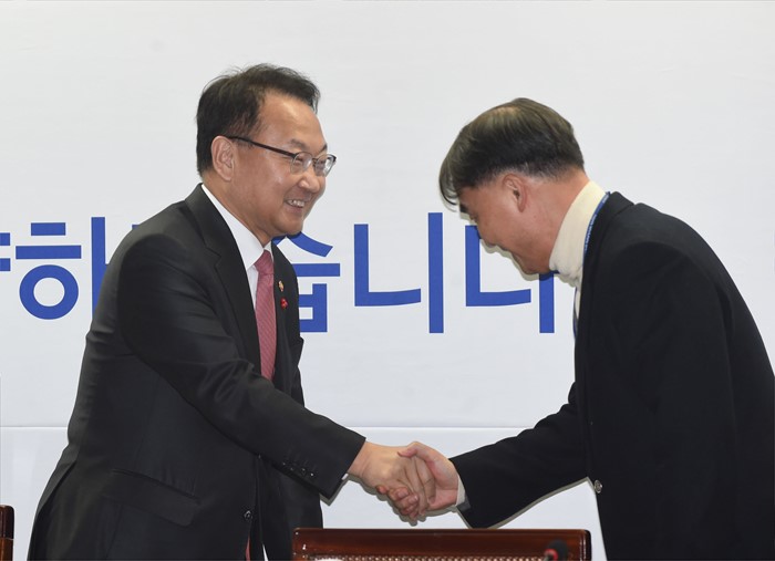 (서울=포커스뉴스) 유일호 부총리 겸 기획재정부 장관이 28일 오후 서울 종로구 정부서울청사에서 열린 제2차 공공기관운영위원회에 참석해 참석자와 악수를 하고 있다. <사진제공=기획재정부>