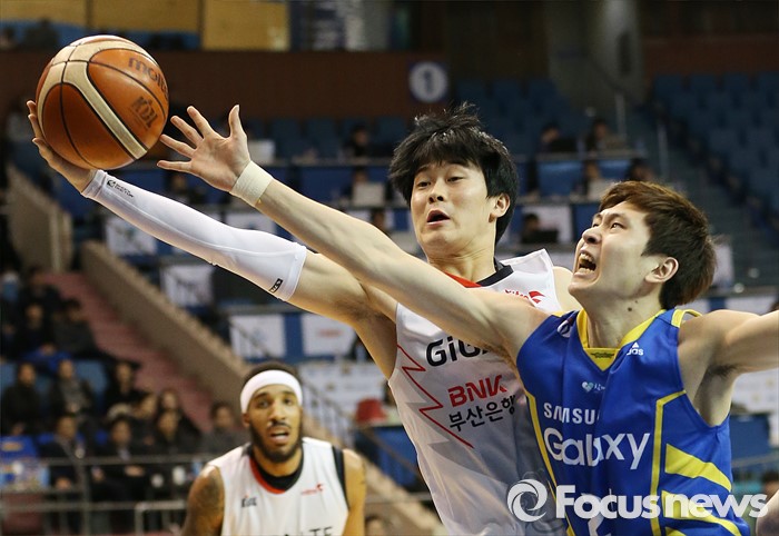 (서울=포커스뉴스) 28일 서울 잠실실내체육관에서 열린 2015-2016 프로농구 삼성-KT 경기에서 삼성 이호현과 KT 최창진이 치열한 리바운드 다툼을 하고 있다.