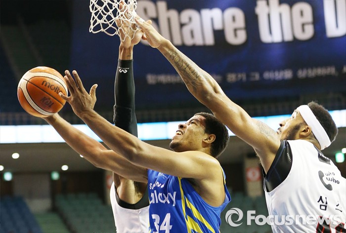 (서울=포커스뉴스) 28일 서울 잠실실내체육관에서 열린 2015-2016 프로농구 삼성-KT 경기에서 삼성 와이즈가 KT 심스와 블레이클리의 마크를 받으며 골밑슛을 시도하고 있다.