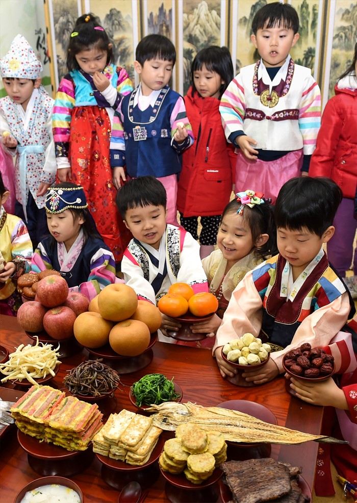 (서울=포커스뉴스) 설 명절을 열흘여 앞둔 28일 서울 서초구 하나로클럽 양재점에서 한복을 차려입은 어린이들이 설 차례상 차리는 법을 배우고 있다. <사진제공=농협유통>
