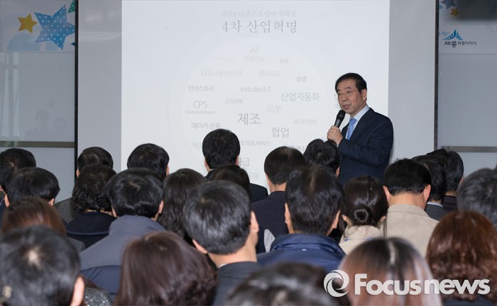 (세종=포커스뉴스) 박원순 서울시장이 29일 오전 세종시청 대강당에서 '협치와 혁신으로 만드는 함께 행복한 삶의 특별시, 세종시와 함께합니다'를 주재로 특강을 하고 있다.