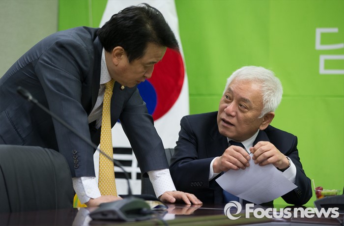 (서울=포커스뉴스) 국민의당 김한길 의원이 29일 오전 서울 마포구 국민의당 당사에서 열린 기획조정회의에서 김영환 의원과 대화하고 있다..