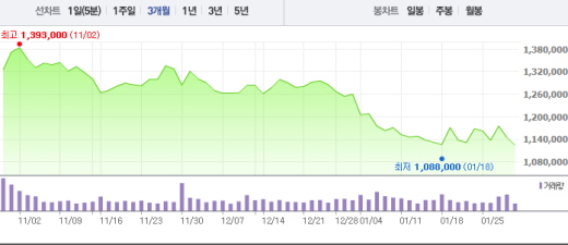 박유악 메리츠종금증권 연구원은 “1분기 비수기로 인한 주가 하락이 예상된다”며 “그렇지만 자사주매입 발표를 통해 주가 하락이 상쇄될 것”이라고 말했다.삼성전자 주가흐름<사진출처=네이버 캡쳐>