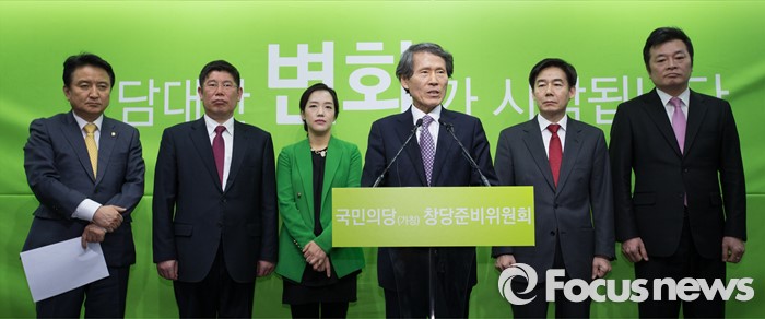 (서울=포커스뉴스) 국민의당 한상진 공동창당준비위원장이 29일 서울 마포구 국민의당 당사에서 열린 방송 정치평론가 4인 입당 기자회견에서 입당인사 소개를 하고 있다. 왼쪽부터 김영환 의원, 김경진 변호사, 강연재 변호사, 한상진 위원장, 이용호 정치평론가, 김철근 동국대 겸임교수.