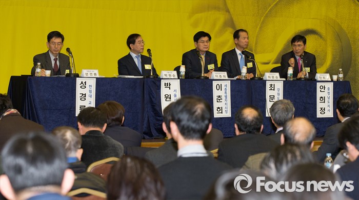 (세종=포커스뉴스) 29일 오후 세종시 정부세종컨벤션센터 국제회의장에서 열린 국가균형발전선언 12주년 기념행사 및 심포지움에 참석한 안희정 충남지사가 인사말을 하고 있다. 왼쪽부터 성경륭 한림대교수, 박원순 서울시장, 이춘희 세종시장, 최문순 강원지사, 안희정 충남지사.